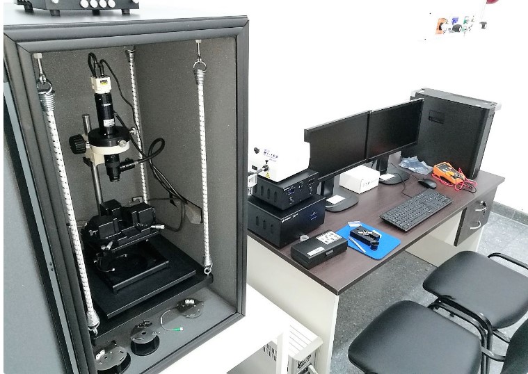 Este equipo cuenta con una cámara de aislación de vibración dentro de la cual se encuentra suspendido. La estación de trabajo cuenta con dos monitores de 19’’, teclado/mouse, caja electrónica principal, controlador de modo MAC, la fuente de luz para el acceso al video controlador principal y PC.