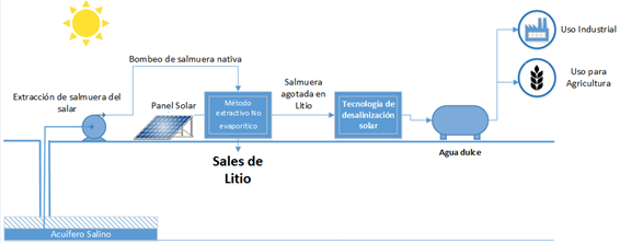 Se evalúa la posibilidad de recuperación de agua dulce en el proceso de extracción de litio de salmueras continentales empleando tecnología solar. Esta tecnología permite tener procesos extractivos más sustentables recuperando gran parte del agua que se evapora en los procesos convencionales de extracción y concentración de salmuera.