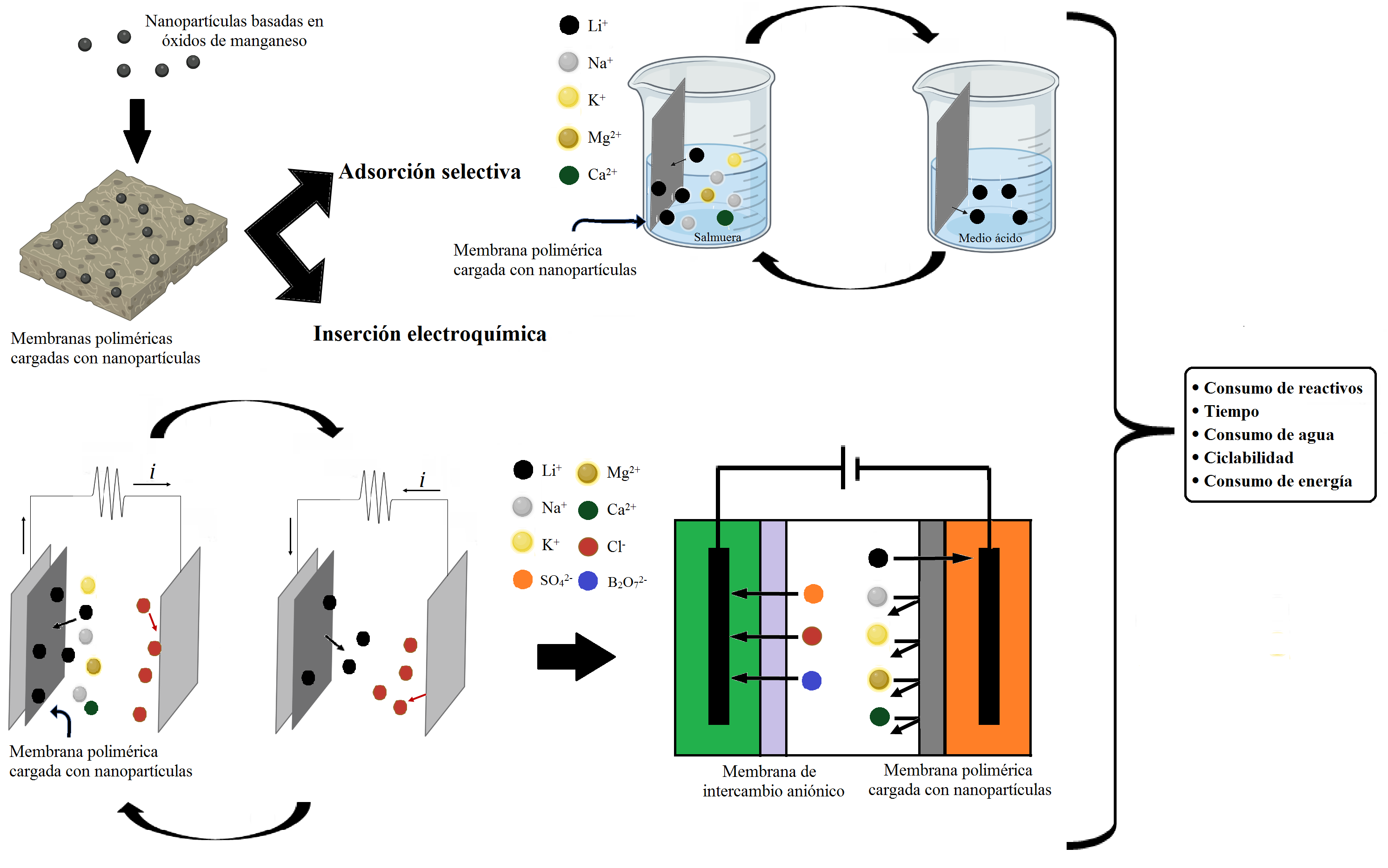 Síntesis, caracterización y evaluación del funcionamiento de nanopartículas basadas en óxidos manganeso y su incorporación en membranas con aplicaciones tecnológicas en torno a la extracción de litio. Se busca mejorar secuencialmente tanto la capacidad de extracción de litio a partir de salmueras, como la ciclabilidad de los materiales sintetizados.
